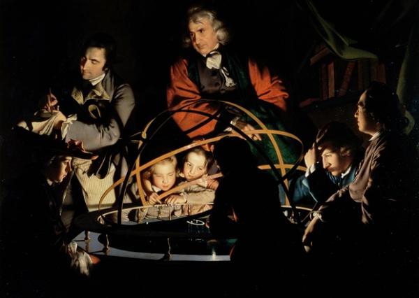 大人和小孩聚集在烛光映照下的铜质太阳系模型周围,向英国18世纪内陆地区一位名叫Brian Cox的男子学习天文知识。这幅画大约作于1766年,是对启蒙时代的精确刻画,同时也成为了英国历史上最伟大的艺术作品之一。