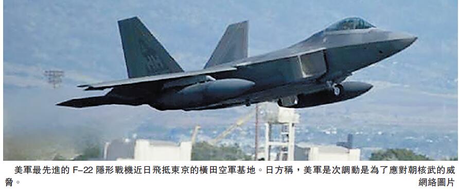 另据最新消息,美国近日突然调派12架最先进的F-22隐形战机到日本。消息称,在事前无通报下,战机分别於20日和21日飞抵东京的横田空军基地,预料还会有多架F-16战机陆续抵达当地。日方称,美军是次调动是为了应对朝核试的威胁。
