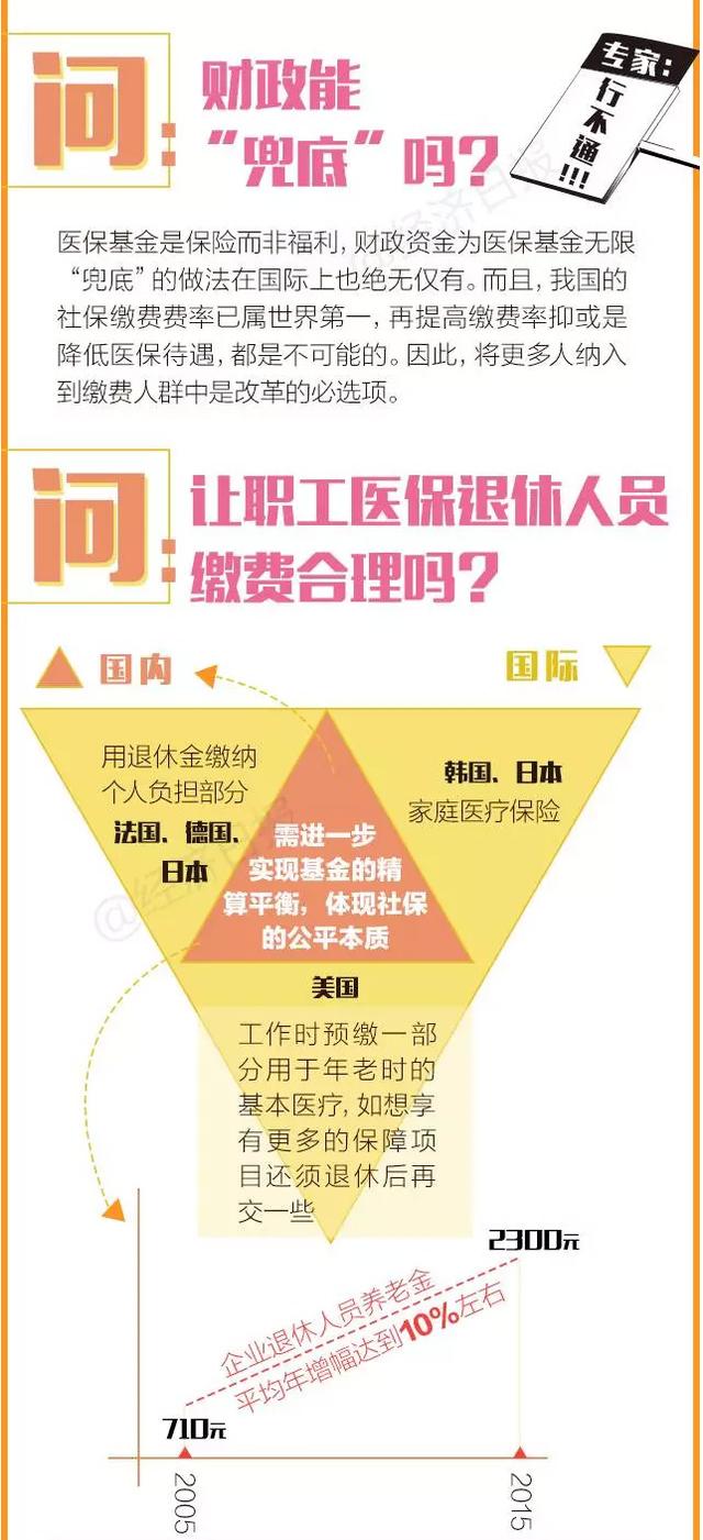 從國際上來看,退休人員繳費是通行做法。北京大學中國公共財政研究中心主任林雙林介紹,目前主要存在三種退休人員繳費的模式:一種是用退休金繳納個人負擔部分,例如法國、德國、日本;一種是工作時預繳一部分用于年老時的基本醫療,但要享有更多的保障項目還須退休后再交一些,例如美國;還有一種家庭醫療保險,例如,韓國、日本等。