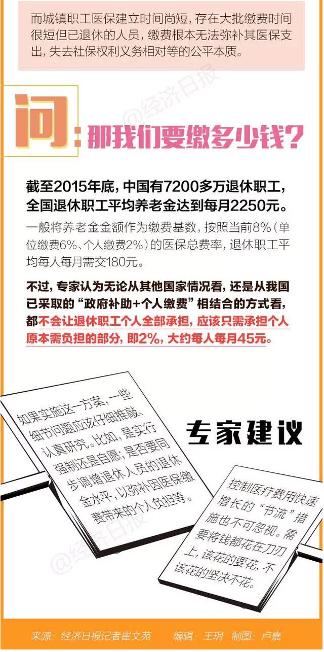 退休人員繳費多少算合理?這也值得推敲。目前我國醫療保險繳費率為工資的8%,其中企業為6%、個人為2%。有一種普遍的猜測認為,退休人員需個人負擔8%。例如,以養老金平均每月2250元為繳費基數,退休人員需要按8%的醫保總費率每人每月繳納180元。“這種提法不符合該政策建議的初衷,也有悖于其他國家退休人員繳費的實踐。”林雙林說,從其他國家情況來看,退休人員只是負擔個人原本需負擔的部分,而不是全部繳費;我國在居民醫保中也是采取“政府補助+個人繳費”相結合的方式,對于退休的老年人亦是如此。林雙林認為,這一繳費費率可能設定為退休金的2%,即當前在職人員參加醫療保險的個人負擔部分,大約每人每月45元。