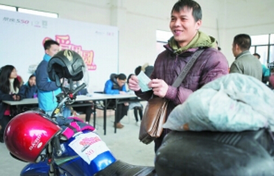 手里拿着刚领到的高铁票,来自广西南宁的张威给记者算了一笔账:按照往年的标准,他骑摩托车回家要14个小时,油费在100元左右,如果是自行托运车子,托运费在200元左右,高铁票则是160元一张,一家三口就是480元,光这笔支出单程就是680元。而今年,他乘坐专列到达贵港取车点后,只需再骑两个小时就能到家,“我们希望年年有这样的活动,哪怕我报不上名,我也为老乡们开心。”
