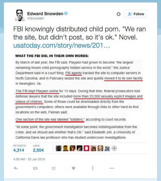 而斯諾登也在 Twitter 上對 FBI 進行冷嘲熱諷,他引用了 FBI 的這句話: