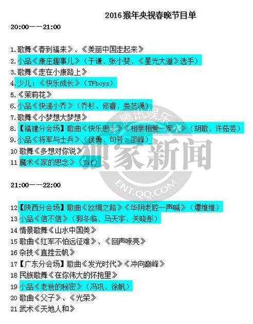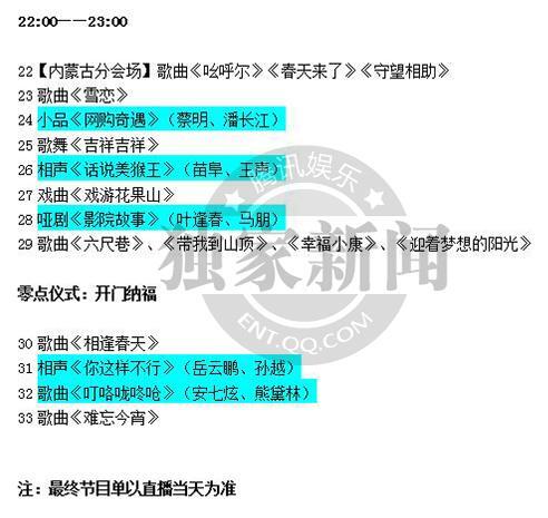 经过腾讯娱乐记者多方打探,还是独家得到了一份今晚的节目单。从腾讯娱乐记者手里拿到的节目单来看,春晚的节目共有四十个语言类节目八个,另外还有杂技、武术等等。