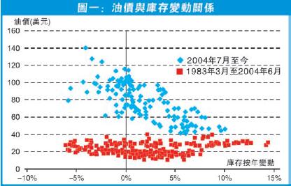 油組與頁巖氣的政治角力,筆者先不多談。反之,另一影響油價的供求因素大為不同,因為供求皆有具體數據參考。現時全球起碼有三個組織可提供原油數據,分別是美國能源部、國際能源署及英國石油公司。美國能源部數據集中於美國地區能源的供求情況,而且未提供全部國家的供求數據,故筆者較喜歡參考英國石油公司及國際能源署的數據。但討論下去前,筆者還要使用一下美國能源部提供的美國石油儲備數據,因為近年坊間都以這數據作為原油市場是否供求失衡及油價會否再跌的重要指標。而圖一亦見到,美國原油儲備多少與油價高低,在2004年中以后或多或少都有點分別。準確點說,2004年中至今開始見到庫存按年變動與油價呈現反向關系,即庫存愈多,油價確實下跌,這符合了大家一貫所想。