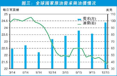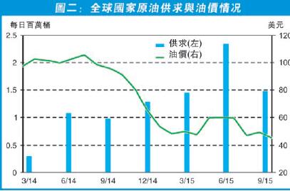不過,儲備始終未能反映全面的供應與需求實況。要看供求各自情況,可參考國際能源署及英國石油公司數據,而市場認為油市出現供過於求就可參考前者。根據國際能源署報告,圖二見到,由2014年油價大跌至去年底,原油市場持續出現供過於求,與坊間所想大致一樣。但留意一點,圖二見到,當油價於2014年中開始急跌至2015年第一季的40至50美元間,原油供求大致保持平穩。同樣地,去年6月供過於求情況突然大幅抽升,但同期油價卻由40美元反彈至60美元。故此,筆者同意原油市場的確出現供過於求,但近年油價下滑是否與實際供求有關,仍然難下判斷。