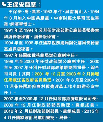 另據了解,他是財稅改革的主要參與者之一,曾擔任過原財政部部長項懷誠的秘書。目前項懷誠是中國人民保險集團股份有限公司獨立董事。一位和王保安打交道多年的人士稱,他是一個有思想觀點,有膽識的官員。不回避問題,非常務實,在部里評價非常高。