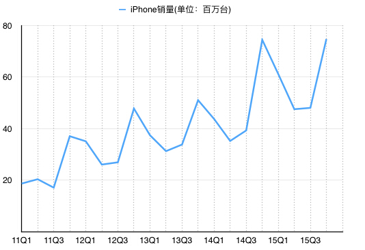 2011年以來iPhone各季度銷量(圖中為自然季度,非財季)