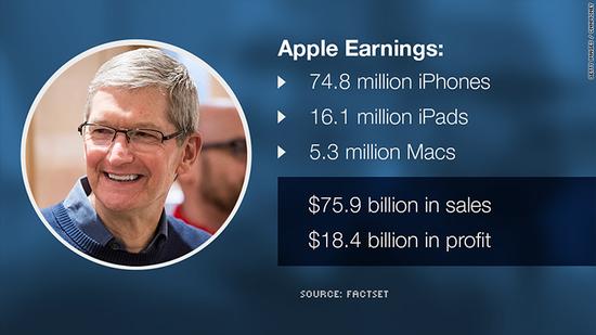 在截至2015年12月26日的第一財季,蘋果公司的淨利潤為183.61億美元,比去年同期的180.24億美元增長2%,創下曆史新高;每股攤薄收益3.28美元,高於去年同期的3.06美元。