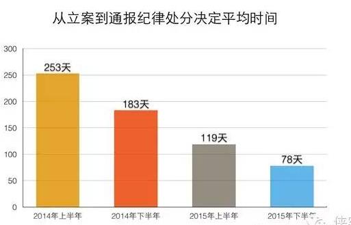 2014-2015年,每半年作为一个时间段,从接受组织调查到发布纪律处分通报,平均间隔时间分别为253天、183天、119天、78天。从单个官员看,2014年被立案调查的时间最长的达到了428天;而2015年,明显提速,最短达到了59天。