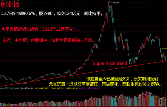 10:08,創業板跌3.4%,報1929,一度破主趨勢。該主趨勢是兩市四板中,最后一只主升勢。