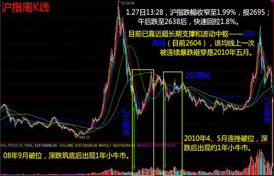 13:38,滬指跌3.1%,報2664,靠近超長期支撐和波動中樞——250周線(目前2604),該均線上一次被連續暴跌砸穿是2010年五月,距離現在已有70月左右時間。