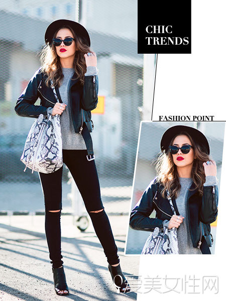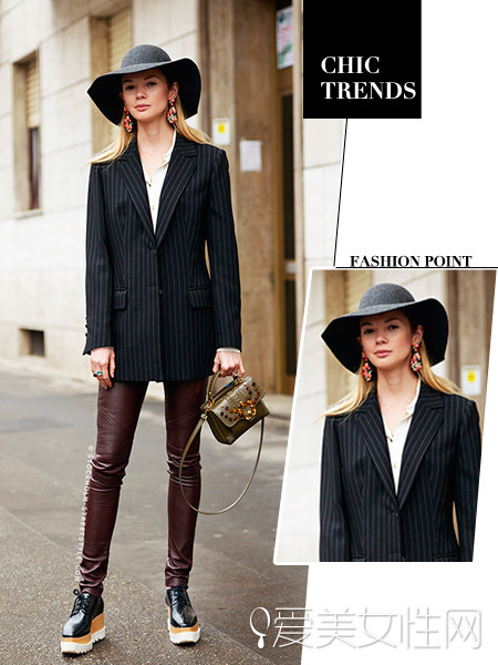 必选第三款———宽檐帽 宽檐帽使近期多数女生朋友都会选择的款式,因为它对于修饰脸型的意义非凡啊!对于任何脸型都百搭的宽檐帽虽然对减龄的作用并不大,但它所散发出来的优雅自信的气质不就是现代女性所追求的吗?第一招,搭配西装皮裤get!