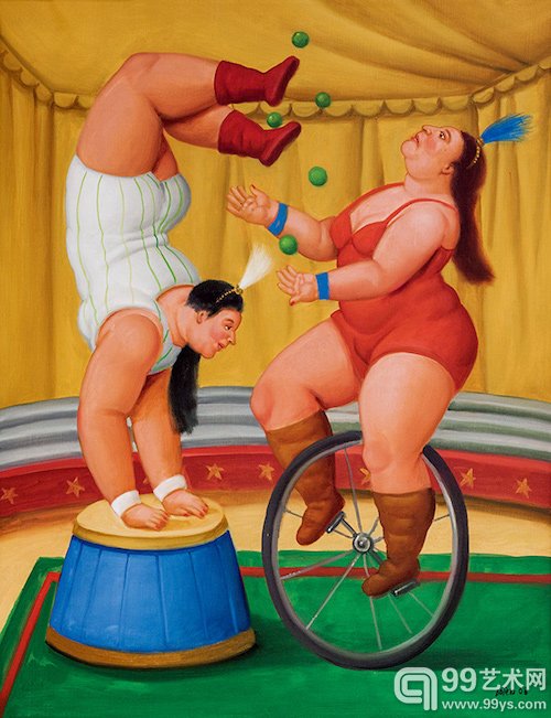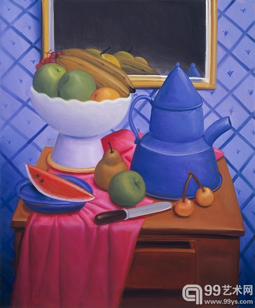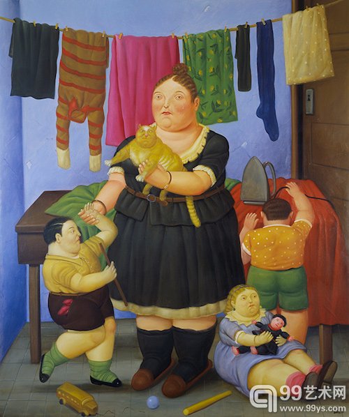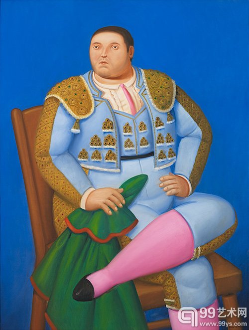 蓝咖啡壶静物(2002),布面油画,122.5cm X 102.5cm 观念艺术风行之下,哥伦比亚艺术家费尔南多·博特罗颇为另类。 这位出生于哥伦比亚麦德林市的艺术家,以形象夸张、色彩明丽的胖子系列绘画闻名于世。他14岁开始绘画,19岁举办了第一次展览,在50多年的艺术生涯中,是世界上最多产的艺术家之一。 如今已经84岁的博特罗,仍然清晰地记得早年在纽约艺术圈的艰难岁月。当时,评论界对他的作品非常蔑视,充满恶意,“如果你是具象的,或者是写实的,那就不要再艺术圈混了。”博特罗回忆说,自己当时找不到愿意代理作品的画廊,也卖不出画。整整十年后,德国一家美术馆的馆长发现了博特罗作品中与欧洲传统一脉相承的那一部分,他由此获得在欧洲的发展机会,一步步成为拉丁美洲最知名的艺术家,也把那些肥胖的人、动物和水果带到了世界各地。 博特罗在美国和欧洲多年,但没有画过一幅家乡之外的作品。“因为那不在我的灵魂里,我的血液里全是哥伦比亚。”他对自己童年和少年时代哥伦比亚以及拉美风情的描绘,因持续和深沉而超越了时代与形式的阻碍,获得了罕见的普适性。日前,“博特罗在中国——费尔南多·博特罗作品展”在上海中华艺术宫开幕。中华艺术宫馆长施大畏说:“他画得很快乐,但快乐中有沉重的生命思索。”展览展出了博特罗的84幅油画和44幅素描,创作时间从上世纪70年代延续至今,从艺术家的个人收藏中遴选而来。与此同时,9座大型雕塑也在中华艺术宫外呈现。 肥胖的杂耍艺人、肥胖的乐手、肥胖的家庭妇女、肥胖的斗牛士……博特罗创造了“胖子”这个独特的艺术形象,这些胖胖的形象很直观地给观众带来视觉愉悦。但实际上,博特罗的艺术大部分与快乐无关,痛苦、愤怒、同情和无奈是他更重要的主题。“博特罗具有非常强烈的人道主义情怀和社会批判精神。在他创作的早期就是以反对军阀独裁和爱国爱家为基调的。这次在上海的展览中“拉美生活”、“马戏团”、“斗牛”系列不仅仅是画拉美的民族风情,更多的是博特罗对拉美人民生活中的无奈与苦难抱以同情。在“宗教”系列中。我们可以看到博特罗对教会的批评和讽刺。”中华艺术宫副馆长李磊如此解读博特罗的创作。 在博特罗的年代,很多拉美艺术家对自己的故土和出身视而不见,而博特罗则把自己视为拉美艺术的继承者。“我对前哥伦比亚风格艺术有着强烈的感情……你们可以感受到我对秘鲁、哥伦比亚以及墨西哥等艺术的浓厚兴趣。”他说,我无法完成欧洲艺术家能做的事,因为自己身上已经烙下了生活在自己的国家的岁月痕迹。