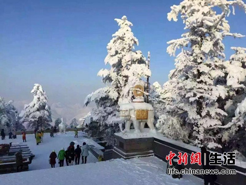 近日,峨眉山景区连降大雪,从金顶一直下到报国寺,让峨眉山变成了一个银色的童话世界,美丽的冰雪胜景令众多游客流连忘返。