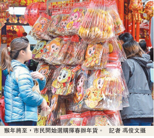 昨日,记者在果栏采访。一间商店员工杨太说,目前尚未到人流高峰期,一般腊月二十後才开始旺,但目前已有部分市民提早到来。她预计今年生意额与去年相若。虽然今年经济差,但市民购买方式不一样,「有钱有有钱的买法,冇钱有冇钱的买法」,「临近年尾,港人办年货也会手松啲」。