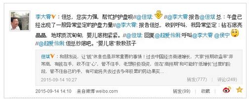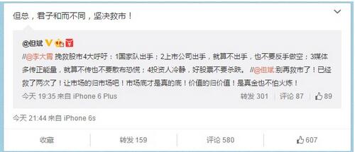 随后李大霄在微博对但斌的呛声做出了回应“但总,君子和而不同,坚决救市!”。