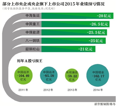 據新京報記者統計,自2011年以來,央企已經連續四年成為A股上市公司中的“虧損王”。中國遠洋、長航油運和中國鋁業(3.850, 0.00, 0.00%)三家公司分別在虧損榜中“登頂”。