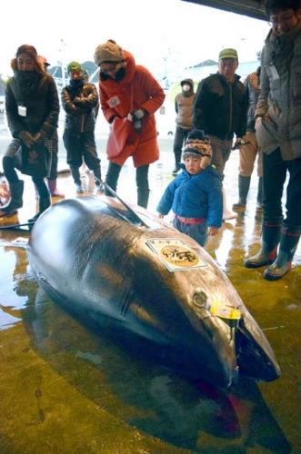 船长儿玉博(49岁)表示“正月刚过,新年首航就捞上这么个庞然大物,还是头一遭呢,真是大吃一惊”。 卸船后的金枪鱼,以1公斤4650日元(约合人民币259元/整条售价为含税209万4174日元,约合人民币11.6645万元)的价格,被那智胜浦町的一家水产公司竞买得手。