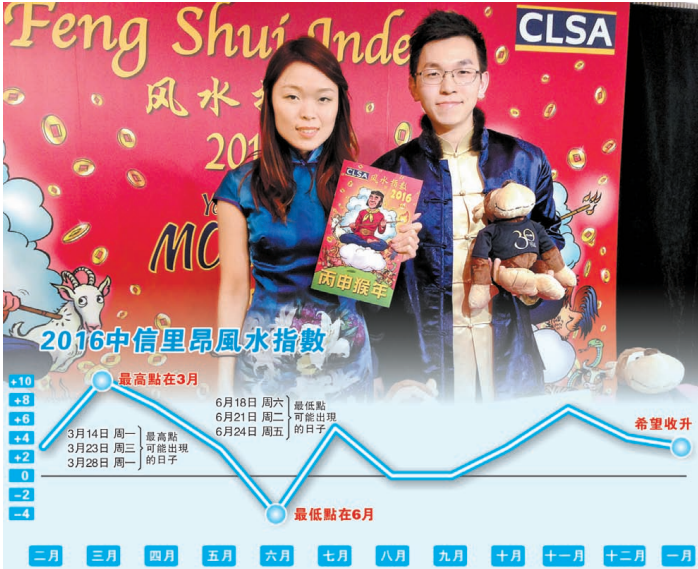 【香港商報網訊】記者劉佳玲報道:中信里昂發布2016年證券風水指數,今年是丙申火猴年,如同喜歡上躥下跳的猴子一樣,恒指的走勢亦將一波三折,預計三月恒指將攀上全年高位,隨后於六月急速回落至全年低位,之后波動上升,預計年末收升。