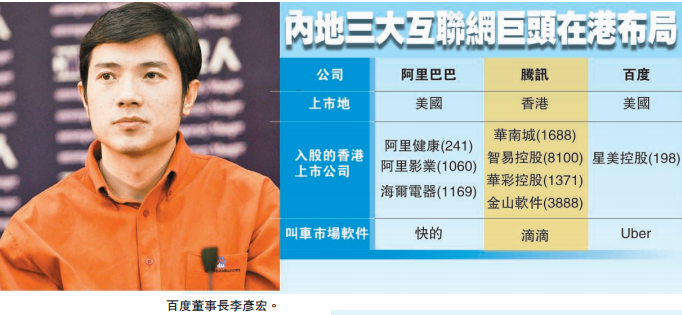 阿里巴巴和騰訊前仆后繼透過注資不同香港的上市公司,紛紛在香港資本市場插旗。BAT中,唯獨百度姍姍來遲,直至去年才急起直追,亦僅觸碰影視業中的細價股。百度在內地積極抗衡阿里和騰訊,為何百度在布局香港方面卻慢人一拍?學者認為,與百度在香港欠缺獨特優勢有關。