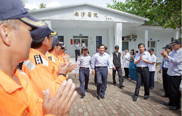 马英九(中)28日前往太平岛视察,到岛上南沙医院视导时,官兵列队欢迎。