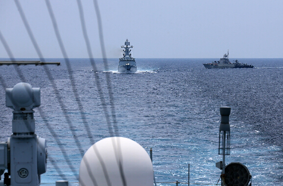 12时30分,中印尼海军联合演练正式结束,双方舰艇悬挂旗帜 笛告别。