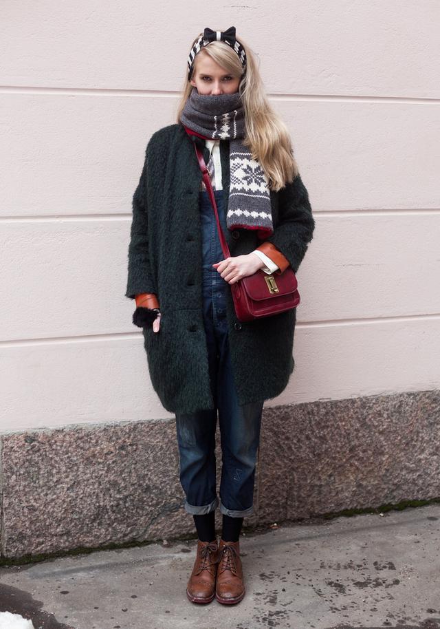 背带裤加上外套的搭配方法,不仅很保暖的说,围上一条围巾,穿着背带裤绝对够拉风,不要再为高跟鞋 MINI裙而发愁也不要再为逛街撞衫而头痛。选择基础款背带裤+长外套,简洁好穿搭不必担心时髦度降低而没面子,配上一双牛津鞋,挽起一点裤脚,让你绝对拉风。