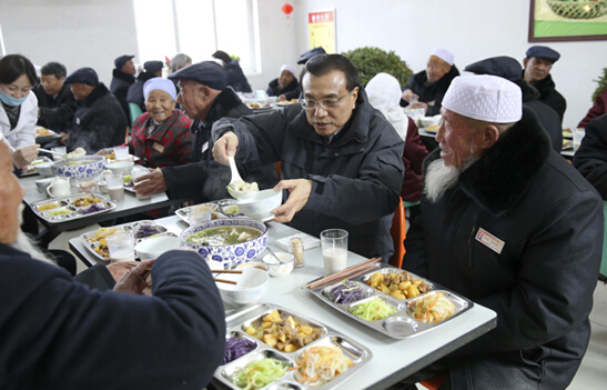 李克强2月1日来到宁夏固原市原州区中心敬老院,与老人们在一起过小年。总理与坐在身旁的回族老人马安仓边吃边拉家常,称赞老人“红光满面”,还给他盛了一碗热气腾腾的饺子。随后,李克强起身举起手中的热饮,祝愿各位老人身体健康,幸福长寿。