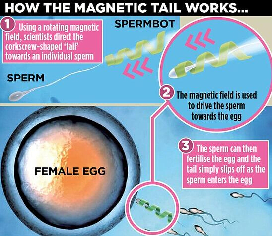 這款機器人的工作原理是,為那些游動緩慢的精子加上一條使用磁鐵提供動力的人造“尾巴”,從而加快這些精子的游動速度。