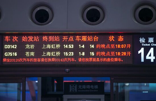 2016年2月1日,杭州火車東站候車大廳的電子顯示屏上顯示的列車晚點信息。