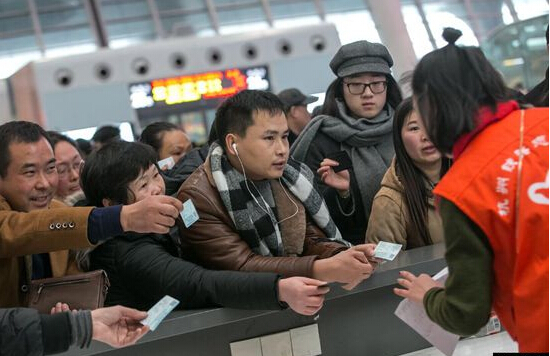 2016年2月1日,杭州火車東站候車大廳,大批滯留旅客在服務臺辦理車票改退簽手續。
