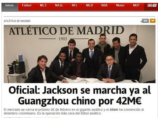 2月3日凌晨, 西班牙《阿斯报》在头版刊出大幅照片,称广州恒大淘宝已经签下马德里竞技的哥伦比亚前锋杰克逊·马丁内斯。随后在8时30分,恒大也官方宣布马丁内斯加盟,转会费4200万欧元(约合3亿人民币),后者也成为今年欧洲冬季转会窗口的“标王”。