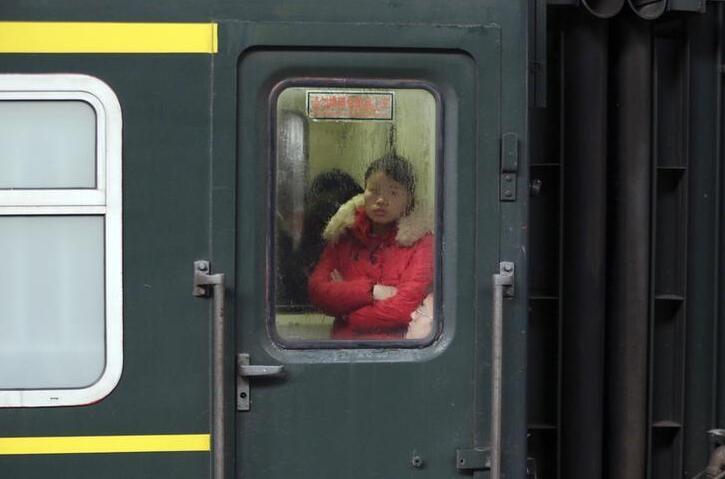 1月27日,无锡,一名旅客通过火车车窗向外观看。 REUTERS/Aly Song