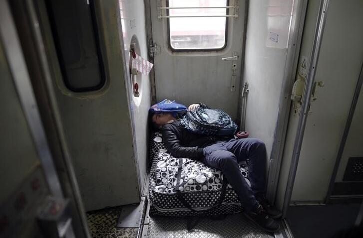 1月27日,苏州,一名男子乘坐火车返乡期间在行李上睡觉。 REUTERS/Aly Song