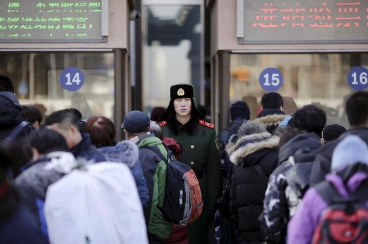 1月24日,北京,一名武警士兵在北京站站岗。 REUTERS/Damir Sagolj