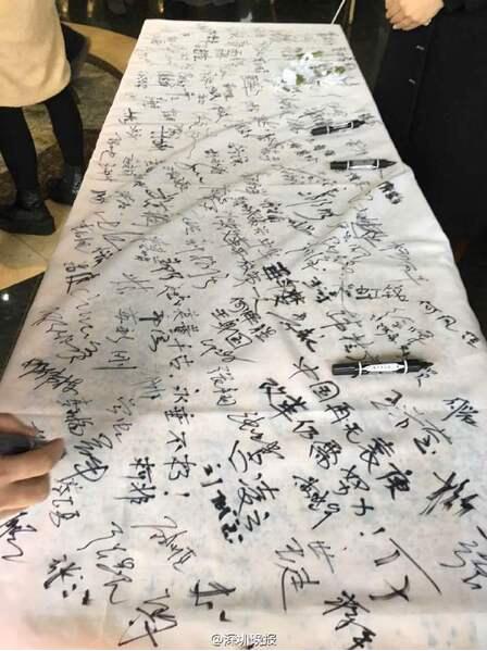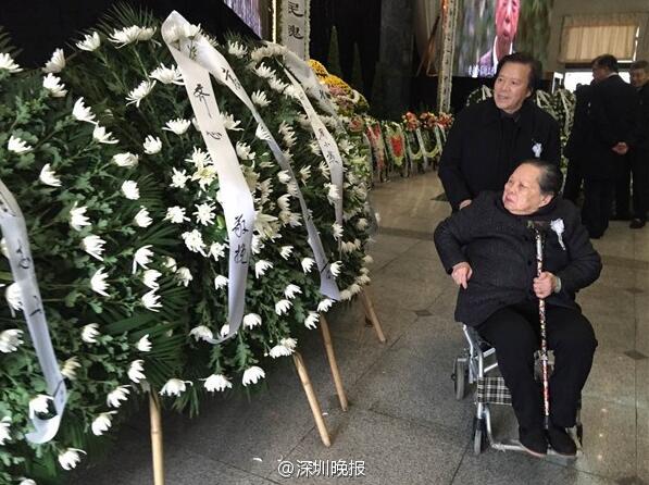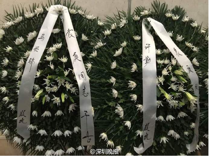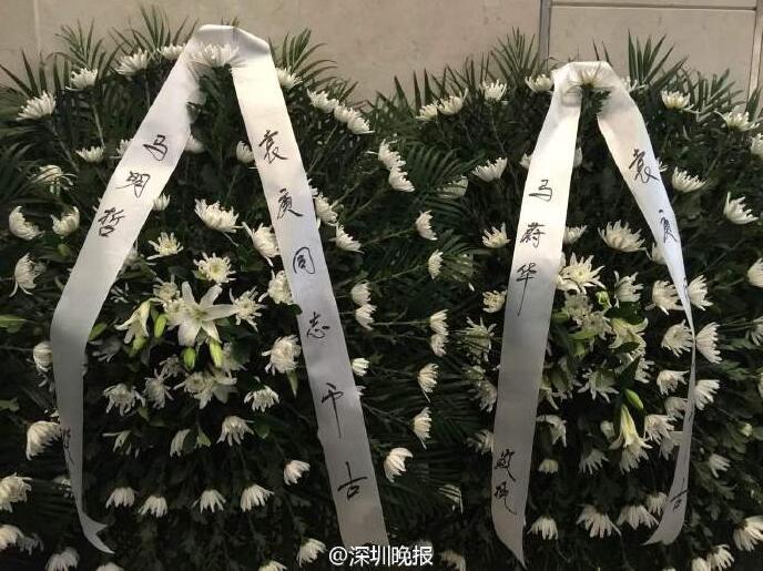 2月4日上午9时,改革开放先驱袁庚追悼会在深圳市殡仪馆举行。江泽民、李克强、王岐山、马兴瑞、许勤等献上花圈。许智明(与袁庚开山之谊)的太太由大儿子推着前来吊唁。前来悼念民众站满灵堂,现场气氛庄严肃穆。图为江泽民、李克强、王岐山、马兴瑞、许勤等献上花圈。