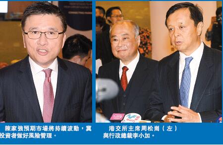 昨日,陳家強出席港交所猴年開市儀式時指,今年市場注定相當波動,除了因為全球經濟增長放緩外,各國財政及貨幣政策出現顯著分歧,同樣困擾市場表現。他預料,全球股市及匯價仍會持續波動,雖然市場波動或為投資者帶來投資機會,但仍要做好風險管理及投資策劃。