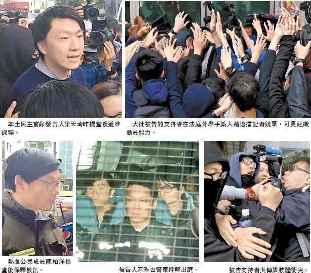 一眾被告昨日由警車押送上庭后,大批本土派青年在九龍城法庭外聚集,每見有被告人士獲擔保外出,即以人牆及外套瘋狂遮擋采訪記者的鏡頭,行動甚有組織,當中有攝影記者曾與遮擋者發生肢體冲突。