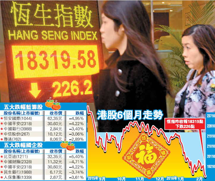 【香港商報网訊】記者莊海源報道:美國聯儲局主席耶倫出席國會聽證會時表示,不排除實施負利率政策的可能,令加息預期降溫。港股跟隨外圍股市下跌226點,收報18319,再創三年半低位。國企指數收報7505,跌153點或2%。港股猴年農歷假期復市后,兩日累跌968.59點,跌幅達5%。