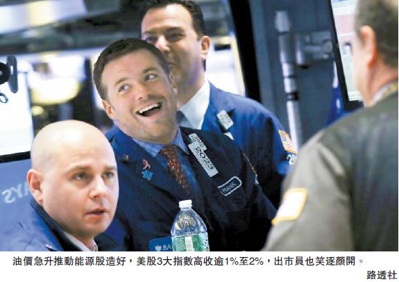 在美股方面,受油價大升帶動,三大指數顯著造好,並帶動金融、商品及其他近日重創的股份反彈。道指收市報15973點,升313點,升幅2%。納指報4337點,升70點。標指報1864點,升35點,結束過去5日跌市。
