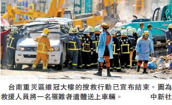 南臺灣在新春前發生的強烈地震災難,昨日公布的數據顯示,已增至116人罹難,尚有1人失蹤。而在臺南市永康區倒塌的維冠大樓,搜救行動昨日宣布結束。據了解,待尋的個案是一名林姓的失聯者,搜救人員尚無法確定是否為維冠大樓的人。在116名罹難者中,有114人是維冠大樓的罹難者。