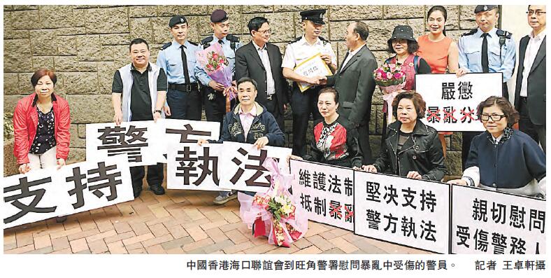 中国香港海口联谊会十多名成员昨日早上到旺角警署送上鲜花及果篮,慰问旺角暴乱中受伤的警察。联谊会主席黄华康表示,今次的行动是希望慰问在年初一晚旺角暴乱中受伤的警察,希望他们早日康复,继续为香港市民维护良好的社会环境。他斥责,反对派在立法会搞事、拉布,破坏经济发展,又煽动青年人在街头使用武力抗争,破坏香港社会安宁。