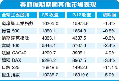 【香港商報網訊】在春節A股休市期間,全球股市卻遭遇了黑色一周。歐洲、美國股市下跌,恆生指數創5年來新低,日經指數更是創下8年最大周跌幅。在一片慘淡之中,A股今日即將開盤,是會隨全球股市補跌?還是會走出獨立行情?專家分析,A股開盤雖然可能也會受到國際市場大跌的影響,但考慮到節前已經有明顯下跌,且輕倉過節的投資者較多,市場最擔心的問題之一人民幣匯率在假期期間也穩中趨升,因此A股節后開盤不宜過分悲觀。