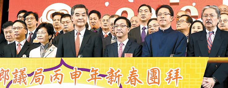 昨早出席新界乡议局丙申新年团拜活动的主礼嘉宾,还有行政长官梁振英、政务司司长林郑月娥、财政司司长曾俊华、律政司司长袁国强、署理民政事务局局长许晓晖、保安局局长黎栋国、运输及房屋局局长张炳良、教育局局长吴克俭、食物及卫生局局长高永文、环境局局长黄锦星、行政会议召集人林焕光等;中联办新界工作部部长刘林、副部长张肖鹰,民建联主席刘慧、新社联主席梁志祥与各界人士近千人。
