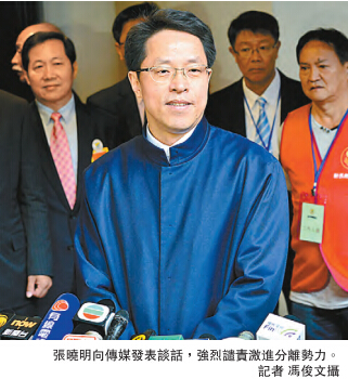 【香港商报网讯】记者周骏报道:中央政府驻港联络办主任张晓明昨早在出席新界乡议局新春团拜活动後,首度就大年初一晚发生在旺角的暴乱事件表明严正态度。他强烈谴责暴徒蓄意、而且是肆意地实施打、砸、烧等暴力犯罪行为,强烈谴责激进分离势力越来越暴力化甚至带有恐怖倾向的活动,强烈谴责鼓吹「暴乱有理」、是非不分、黑白混淆甚至意图嫁祸於人的奇谈怪论。他对旺角暴乱中受伤的警察和新闻工作者表示慰问。