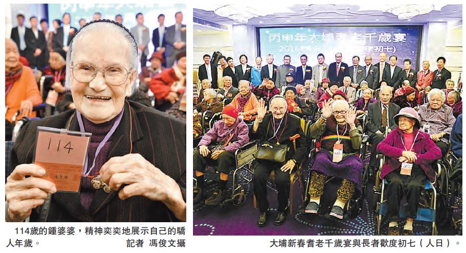 由大埔万家庆新春活动委员会及大埔万家庆新春丙申年耆老千岁宴委员会举办的千岁宴於区内12个不同地点举行,吸引超过6000名73岁或以上的长者参加。当中最年长为婆婆锺贵娇,样子精灵活泼,身体十分健康,出入只需轻微靠柺杖帮忙;另外两名105岁的婆婆陈槐春及吴李娇亦有出席,大会向超过50名年届97岁或以上的长者颁赠纪念金牌。大埔区「耆老千岁宴」自1981年开始举行,至今已超过30年历史,是区内历史最悠久及最具代表性的活动之一;每年均会在农历年初七举行,与区内长者一同庆贺农历新年佳节及「人日」生辰。