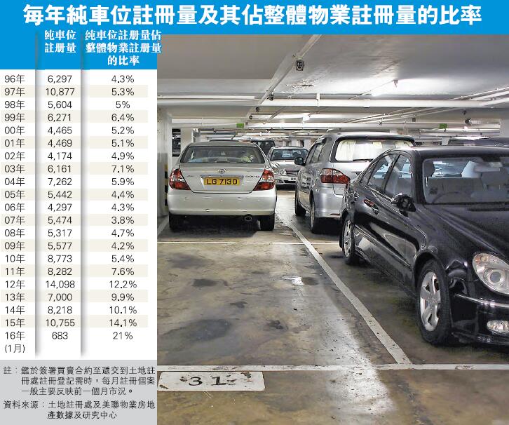 由2012年至去年這四年期間,其中2012年和2015年純車位註冊量超過1萬宗,2012年的1.4098萬宗更是近20年最高。祥益地產總裁汪敦敬指,樓市處於高峰期,而且適逢政府推出辣招,壓抑住宅市場不少購買力,故部分購買力轉去車位市場,因此近幾年車位價量皆上升。