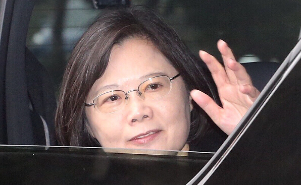 蔡英文(图)15日上午赴民进党中央党部办公,抵达党部时摇下车窗向媒体挥手致意。台湾“中央社”
