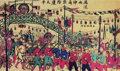 这些作品分别从不同的侧面反映重大历史事件和都市新兴的奇观胜景,体现了当时市民阶层对时事的关注和评价。这些用传统的艺术形式表现社会新闻的年画,是其他美术种类中鲜见的,可谓一大创举,堪称年画史上浓墨重彩的一笔。 当时的年画商既紧追时代潮流,又以最大限度赚取商业利润为主旨,尽可能地减少商业成本。如有一幅《中外通商共庆大放花灯图》的年画,系上海小校场沈文雅年画铺为庆祝1893年上海开埠通商50周年而刻版刊印。该画人物众多,场景繁复,画面构图巧妙合理,层次分明,生动地展现了上海商界欢庆游行的场面。画面上,走在队伍最前面的是寓沪西人的消防队,当时,在盛大的庆典中消防队往往应邀进行水龙演练以增加喜庆气氛。其后一人手擎“令”字大旗,威风凛凛;随后有锦牌、锣鼓开道,花轿、花灯、舞龙、舞狮等节目夹杂在队伍之中,而全套行头的戏班则紧跟在队伍后面。马路上到处张灯结彩,道路两旁站满了围观的市民,一派喜气洋洋的热闹气氛。就是这样一幅有着鲜明时代和地域特色的作品,在十余年后又被年画商们翻出来,巧妙地移用来表现当时震惊中外的辛亥革命。1911年10月10日,武昌起义爆发,打响了推翻清王朝封建统治的第一枪。随后,南方各省相继宣告独立,响应革命。12月28日(农历十一月初九),独立的17个省份各派代表在南京举行会议,准备组建中华民国临时政府。第二天,大会投票选举中华民国临时大总统,孙中山先生凭借其崇高的威望以16票(各省1票)当选。消息一经传出,全国人民欢欣鼓舞,上海工商各界也为之举行盛大的庆祝活动。小校场的年画商们也闻风而动,敏锐地捕捉这一时机,做了一笔“移花接木”的生意。他们将画面上“中外通商共庆大放花灯图”11个字剜掉,在同一位置巧妙地嵌上“上海通商庆贺总统万岁”10字,并将游行队伍中的“令”字旗移换成“汉”字旗(上海历史博物馆藏有此画的木版,上面剜刻的痕迹非常清晰),这样,一幅反映辛亥革命的时事年画就诞生了。这充分表现了当时年画商紧跟时代的敏锐意识,也反映了他们聪明,善做生意的经商本领。这幅年画蒙蔽了很多人,在当时广受欢迎,并被后人视为珍贵文物。