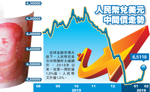 【香港商报网讯】记者锺侠报道:昨日是内地猴年首个交易日,在全球金融市场大跌背景下,人行将人民币兑美元中间价大幅上调至6.5118,此举意味人民币汇率较节前收盘水平价涨近1%,创1月4日来最高水平。与此同时,离岸、在岸人民币汇率双双涨破6.50,在岸人民币盘中最高涨至6.4880,较前收盘价涨1.35%,创2005年来最大涨幅。市场普遍认为,除美元等外部因素外,人行行长周小川就人民币汇率的表态是此番人民币升值的重要原因,未来一段时间人民币汇率保持稳定或是主基调。